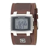Water-resistant to 330 feet (100 M).Dual time, light, multi-function countdown timer, stop watch with lap and lap recall, 4 daily alarms and date functions.Genuine leather strap with metal badge detail.316L stainless steel case: the highest grade of stainless steel for water resistance, strength and non-corrosion in a marine environment.Case diameter: 40 mm. The Rip Curl Men's Bronx Digital Chocolate Leather Watch is a hip, modern timepiece. Its rectangular-shaped, digital dial offers dual time function, a countdown timer, a stopwatch with lap recall, four daily alarms, and a date function along with a handy backlight. The 316L grade, stainless steel case and bezel provide strength, durability, and are non-corrosive in water. The watch is water resistant to 330 feet (100 meters) and has a mineral crystal window that provides excellent scratch resistance. Made from brown leather, the watch strap is the same width as the case for a cool, cuff-like look. The watch is equipped with reliable quartz movement with synthetic rubies that reduce torque and friction and allows it to run accurately for longer periods of time.